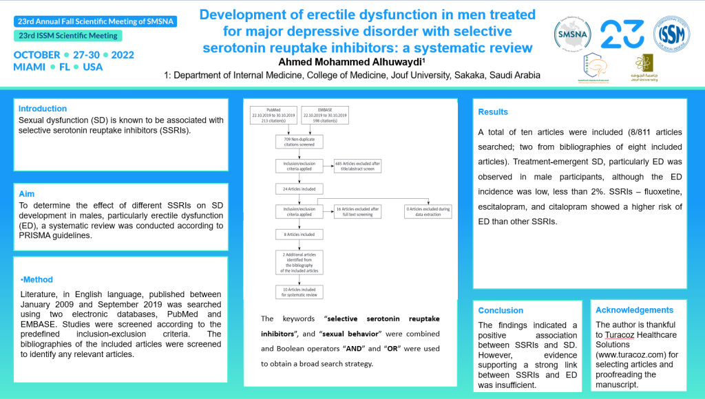 Non-discussed E-poster abstract entitled “Development of Erectile Dysfunction in Men Treated for Major Depressive Disorder with Selective Serotonin Reuptake Inhibitors: A Systematic Review” presentation at the ISSM/SMSNA Joint Scientific Meeting 2022.